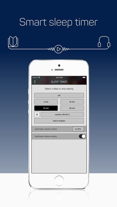 • A sleep timer with adjustable sleep periods or sleep after the end of the current chapter.