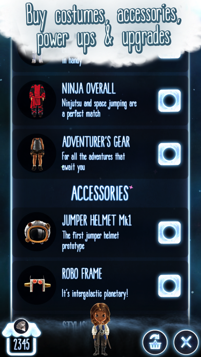 • Buy new costumes, accessories, power ups and upgrades