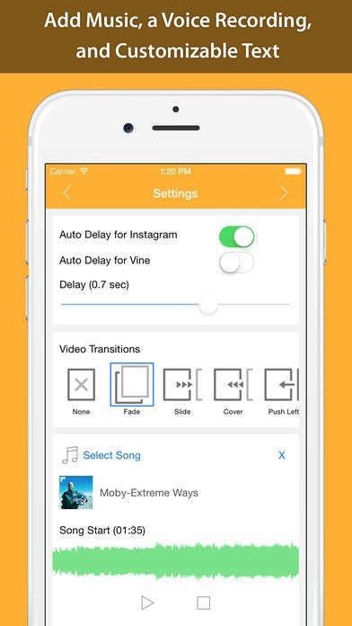 動画にはiTunesなどにある楽曲から好きなものをBGMとして追加することができ、その再生位置も自由に選べるので、大好きな曲のサビの部分に合わせて動画を再生させることも可能です。