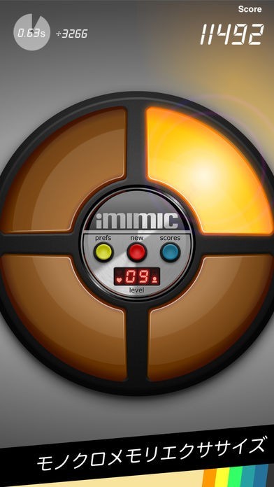 App Storeより引用80年代が戻ってきた!このレトロな電子ゲームで記憶力を鍛えよう!iMimicから出される、音と光の順番を記憶して次にそれを順番通りに再現。最初はひとつの音から始まって、順を追うごとに一音ずつ音が増えていきます。iMimic についてこられるか挑戦だ!