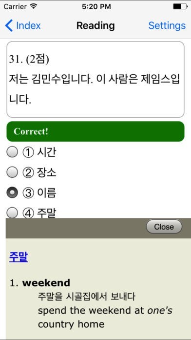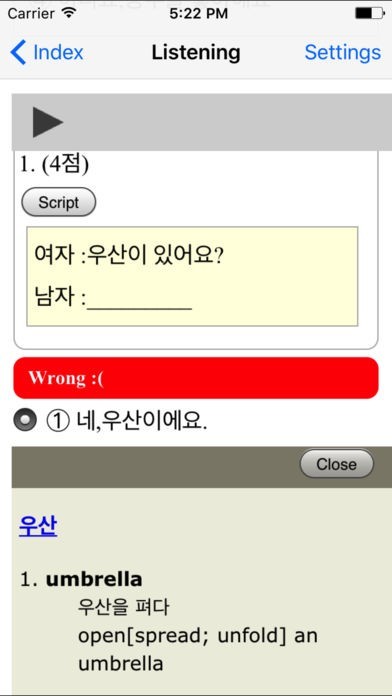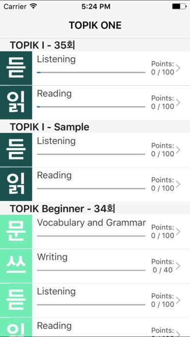 App Storeより引用- TOPIK I: 7 previous tests (35회 to 37회, 41회, 47회, 52회 and a sample test)