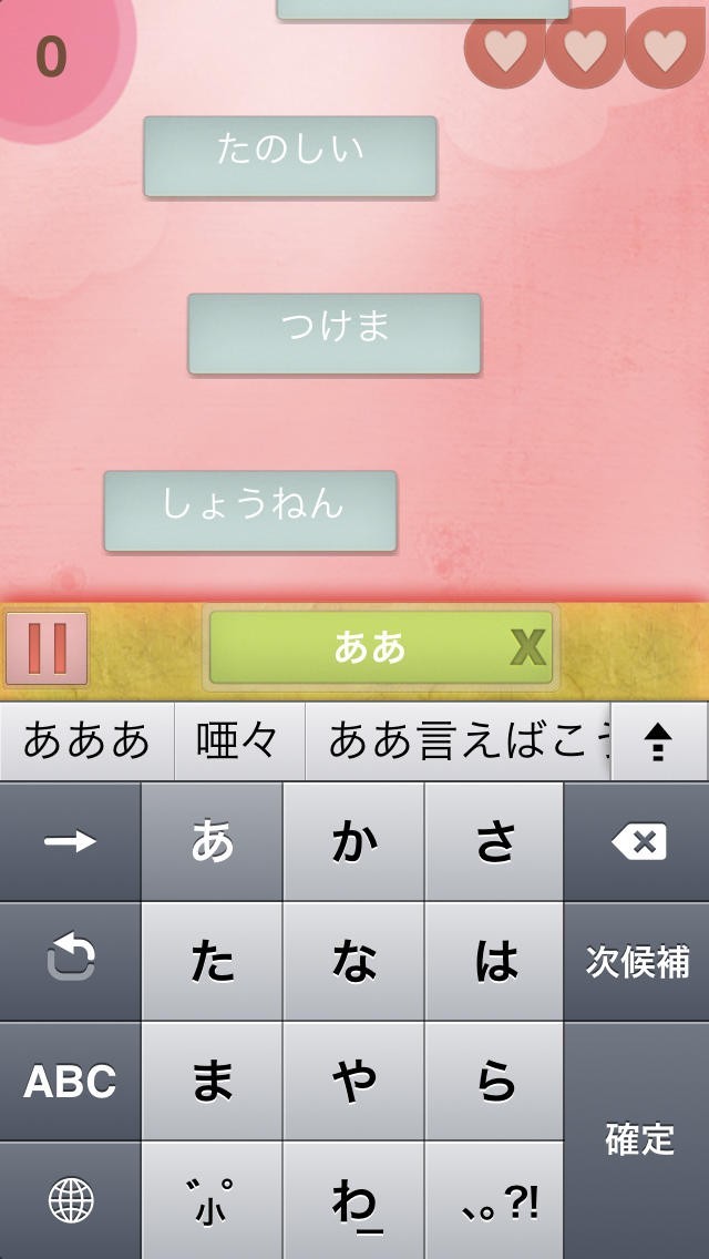 流れてくるひらがなの単語をフリック操作で入力することで消していく!