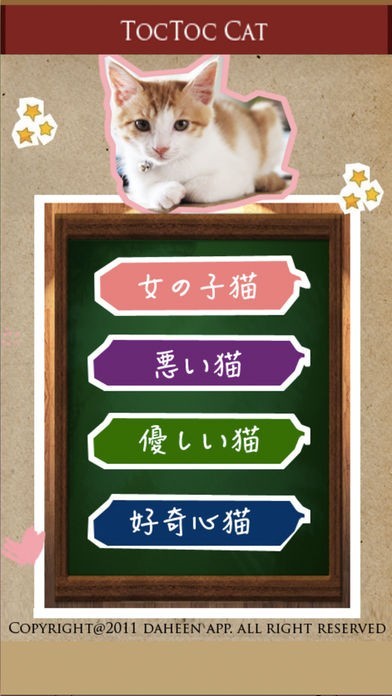 会話をさせたい猫を選び、言葉を選びます。言葉と一緒に、言葉に合った表情やしぐさの猫の画像が表示されます。猫をタッチすると猫語を話します。猫のそばで鳴らすと、何となく会話ができているような気持ちになれ楽しくなります。