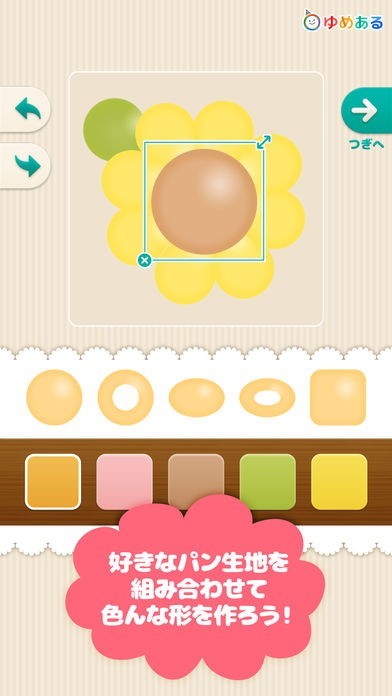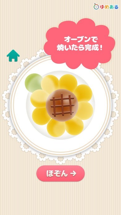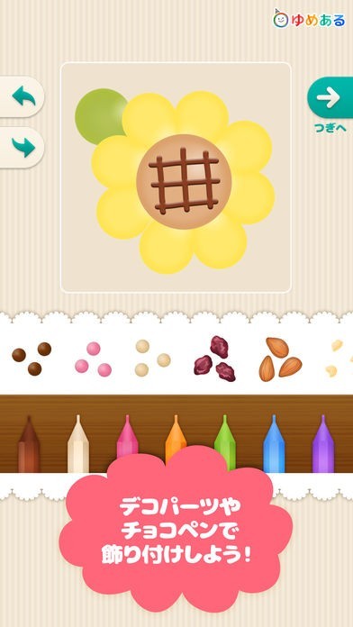 カラフルなチョコペンやアーモンドやナッツ、チョコチップなどのデコレーションアイテムを使用して可愛らしいオリジナルパンを完成させる知育型シミュレーションゲームです。生地の色もいくつか用意されているので色々な種類のパンを作成できます。