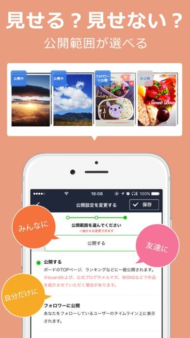 撮影した写真を集めてオリジナルのアルバムを作れる!そんなアプリがboardです。アルバムの中に保存されている写真からアルバムに登録したいものを選択するだけでアルバムを完成させることができます。写真は触ってめくるように操作できるので便利です。作成したアルバムは公開することで友達とシェアすることができます。もちろん公開範囲を設定することができるのでプライバシー保護にも配慮されています。アルバムはSNS上に発信することも可能です。