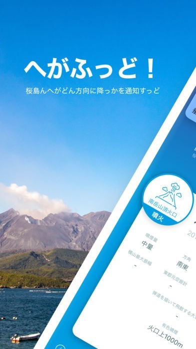 こんアプリは、桜島ん噴火や爆発によってどん方向にへが降っかを通知すっアプリじゃっど。