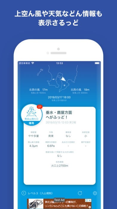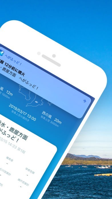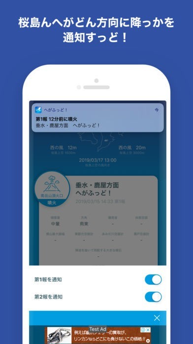 このアプリは、桜島の噴火や爆発によってどの方向に灰が降るのかを通知するアプリです。