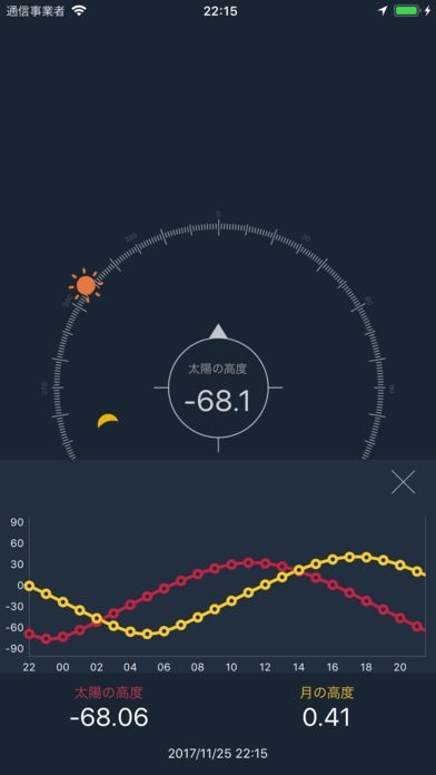 課金することで太陽と月の高度が分かるようになります。線グラフで月と太陽の高度をチェックしましょう。24時間の高度の変化をすべて把握することができます。季節による違いをチェックしても面白いでしょう。