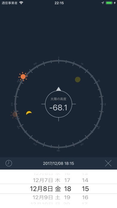 アプリを使えば太陽と月の位置関係を日付ごとに確認することができます。画面下から日付を選ぶと、コンパス内に太陽と月の位置が表示されます。365日すべての位置関係の把握ができます。