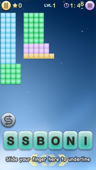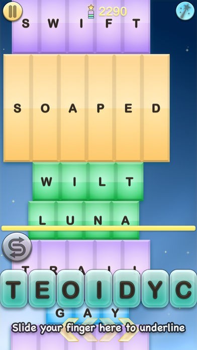 Jumbline 2 includes two additional games: Cloud Pop and Star Tower. In Cloud Pop, your goal is to pop as many clouds as possible, by spelling words out of the letters carried in each cloud. In Star Tower, your task is to build the tallest tower you can, before it sinks into the ground, by making and staking words out of an infinitely jumbled line of letters. The larger the word, the slower your tower sinks, so scramble and twist your brain to think big!
