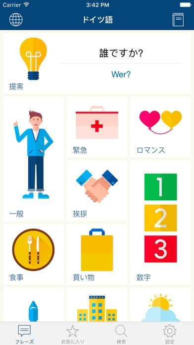 800以上ものドイツ語を学習出来るアプリです。 挨拶、食事、買い物、趣味など様々なシーンで良く使われるフレーズが収録されており、ドイツ旅行に行く時に役立ちます。 自分の発音を録音し、正しい発音と比較する事が可能です。 海外旅行に行く前、スマホの設定方法が難しくて現地で使えないという時でもネット接続不要で使えるために大丈夫です。 話す聞くを繰り返せるため、難しいドイツ語でも習得しやすくなります。 見やすい大きさにフォントを調節する事が可能です。