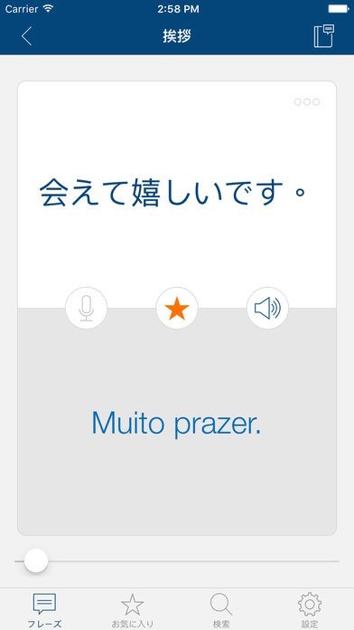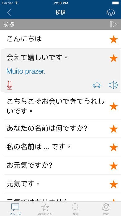 「無料でポルトガル語を学ぼう」では、シチュエーションごとによく使うフレーズが表示されるので、状況ごとに学習することが出来るようになります。 また、音声ボタンでは発音を聞くことができ、リスニングや正確な発音を学ぶことができます、 次に、マイクボタンでは、聞き取ってもらうというようなことができます。 また、星のマークをタップするとお気に入りに登録できることから、理解することが難しいようなものがあれば登録して、あとで再チェックするといった使い方もできます。 他にはフォントサイズを調整する事が出来ることから見やすいように作り変えることも可能ですし、インターネットの通信が無くても使えるので通信制限で悩んでいる人も安心です。