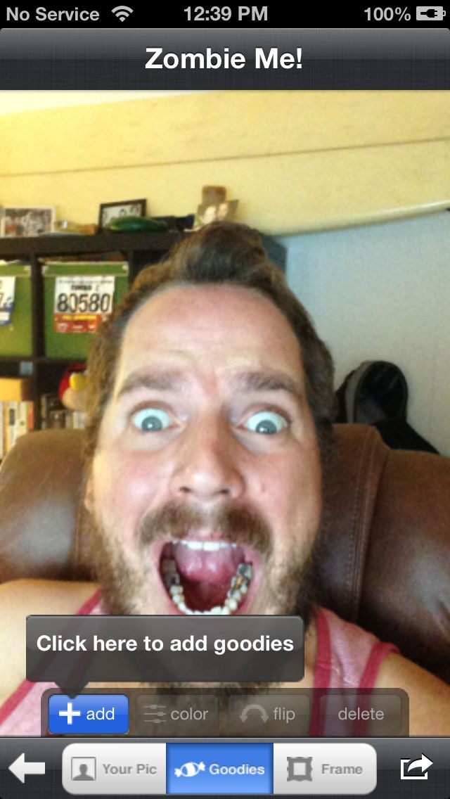 ちょうど写真を取る (またはあなたのライブラリから 1 つを選択)、プラス記号をクリックして、怖いイメージを追加します !