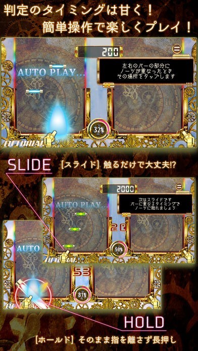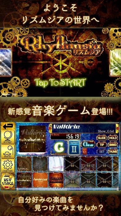 落下するノーツに合わせてタップや傾けを行おう!隠し曲のコンプリートなどやり込み要素も満載!