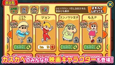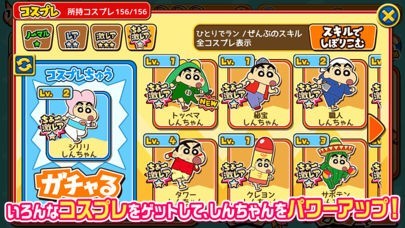 クレヨンしんちゃんの横スクロールアクションです!ゲームを進めて手に入るアイテムや衣装がついつい集めたくなってしまう可愛いものがたくさんあります!