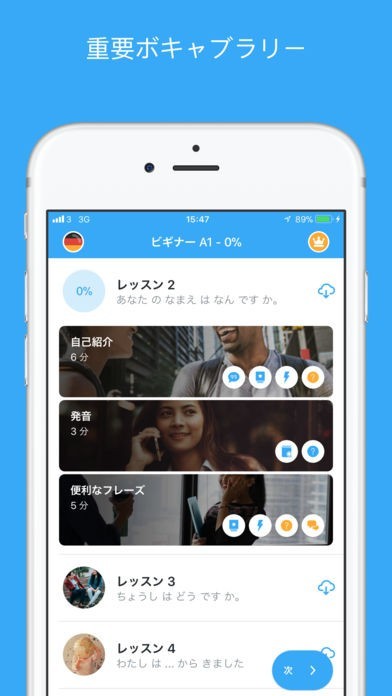 アプリ内のレッスンでは自己紹介や便利なフレーズなど、基本的なものも細かく分類されています。オフラインモードでも利用できるので、電波状況を確認する必要がなく便利です。