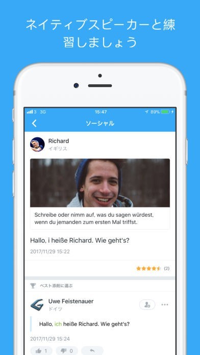 語彙や文法の学習はもちろん、会話文をネイティブスピーカーに添削してもらうこともできるため、より正確で実用的なドイツ語を身につけることができます。独学でも安心です。