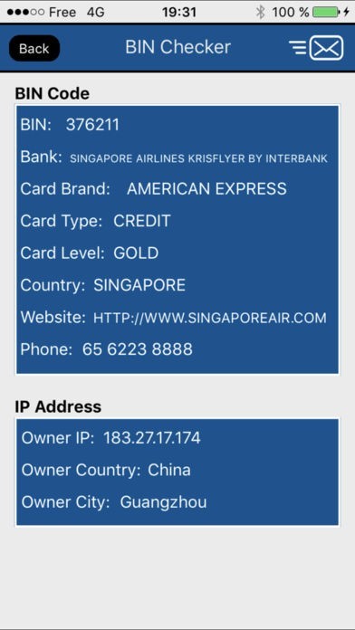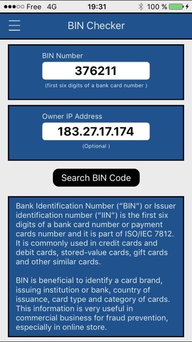 You can check the BIN number (the first 6 digits of a credit card). The application will display the information about this number like bank name, card type, card brand, country, website ....