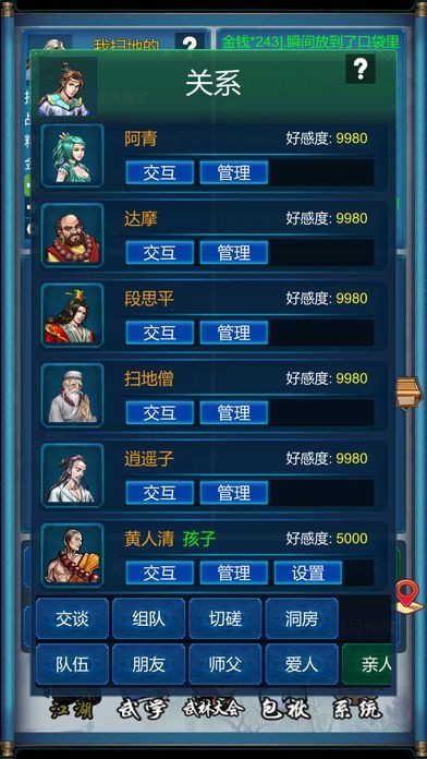 关系管理: 拜师(请教)、结婚(洞房)、结拜(+攻击+命中)