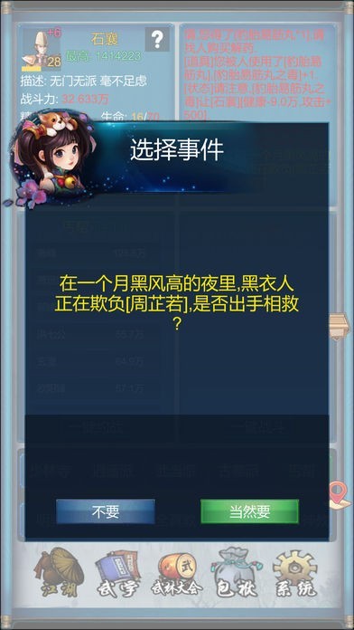 您可选择去各大门派游历,途中可能遭遇各种突发事件。