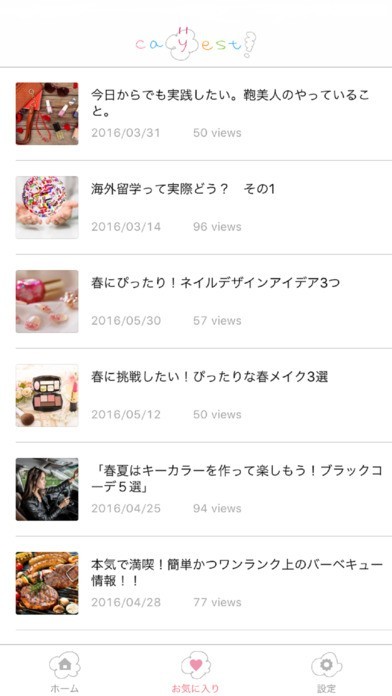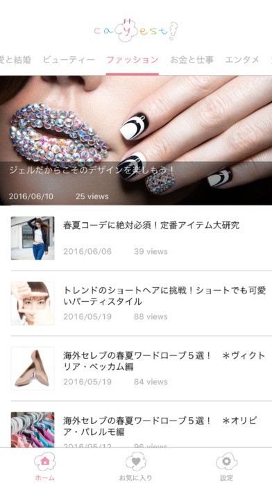 「ca y est!」を使えば「恋愛と結婚」、「グルメ」、「エンタメ」などのいろいろなカテゴリーに分かれているので、自分が求めている情報を手に入れることが可能です。 よて、忙しい主婦やOLの方でも限られた時間で情報収集することができます。 また、特に気になったものや後で再チェックしたいものがあれば、ハートボタンをタップすることによって、「お気に入り」タブから確認することができます。 それ以外にもツイッターやフェイスブックなどで、「共有」することができるので、友達に知らせてあげたい情報があったら教えてあげて、コミュニケーションのきっかけに使うことができます。
