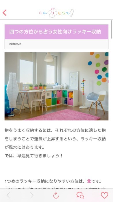 「ca y est!」を使えば「恋愛と結婚」、「エンタメ」、「グルメ」、「旅行おでかけ」などのいろいろなカテゴリーに分かれていて合計では11個もあるので、自分が求めている情報を手に入れることができるますし、忙しい主婦やOLの方であっても限られた時間で情報収集することができます。 さらに、ツイッターやフェイスブックなどで、「シェア」ボタンをタップするだけで共有することができるので、友達に知らせたい情報があった場合に使うと役に立ちますし、会話のきっかけにもなります。 また、特に気になったものや後で再チェックしたいものがあれば、ハートのボタンをタップするだけで、「お気に入り」登録することができるので、あとからまとめて確認するという使い方ができます。