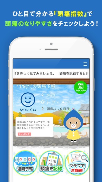 登録地域に特化した頭痛予想、天気予報、気圧、温度をカワイイアニメーションでお伝えします!
