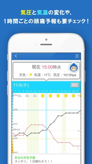 時間ごとの天気、気圧、気温の変化が、グラフで見れるのでとても便利!