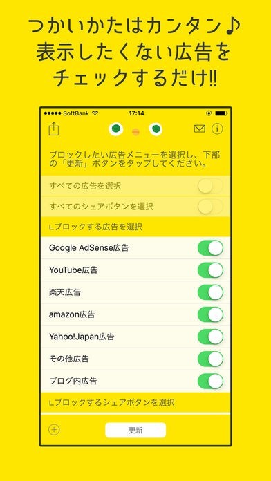 ●1.ひよこ広告ブロックアプリを起動し、ブロックしたい広告メニューを選択し、「更新」ボタンをタップしてください。
