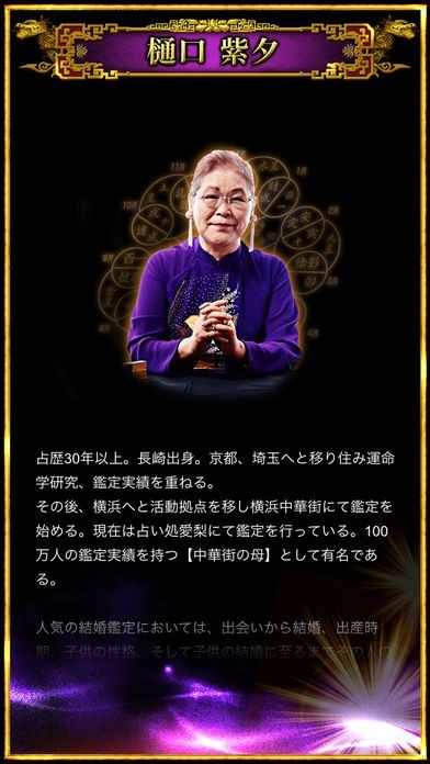 横浜中華街の宣伝ポスターに掲載されるなど、中華街で右に出る者のいない、老若男女、国境問わず厚い信頼を寄せられている的中鑑定士である。