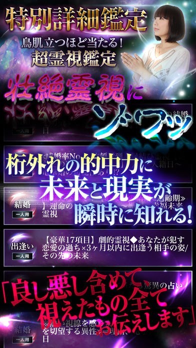 このアプリを監修している菊理なみによる未来を見通すことのできる超霊視占いによって、あなたの恋愛における悩みや不安を解決することができます。詳細鑑定もできるのでおススメです。