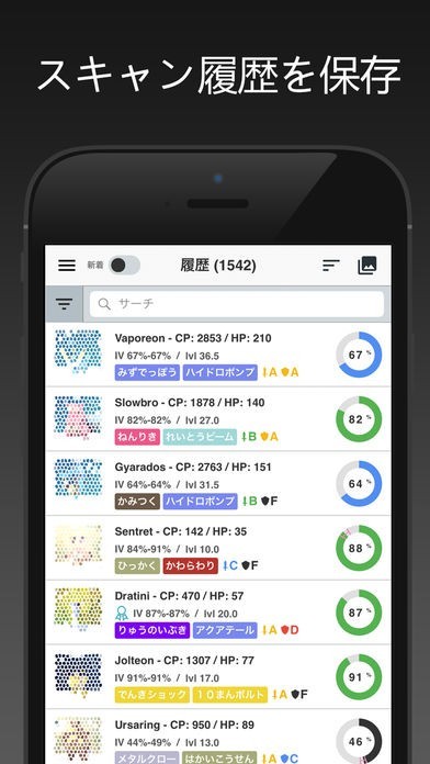 スキャン結果の履歴を保存する機能を搭載しています。スクリーンショット撮影日やIV、CPなどで分類しながら履歴を保存してくれるため、後程見返した際にも判りやすいのが嬉しいポイントとなっています。