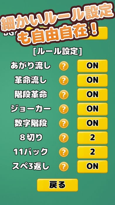 地域によって違うちょっとマイナーなルールも搭載されています。 革命流しや階段革命などよく分からない方もいることでしょう。そんな時はOFFにしてください。 いつも通りのルールで楽しくプレイできます。