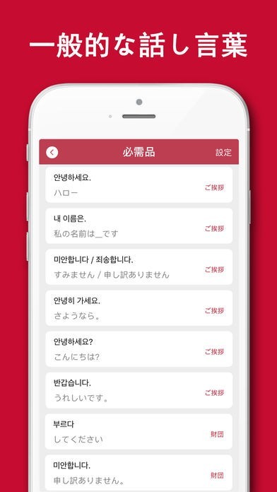 こんにちは、さようならといったあいさつなど、日常的に使うことが多いフレーズがいくつか掲載されています。まとめて表示できるので、隙間時間を使って勉強することができます。