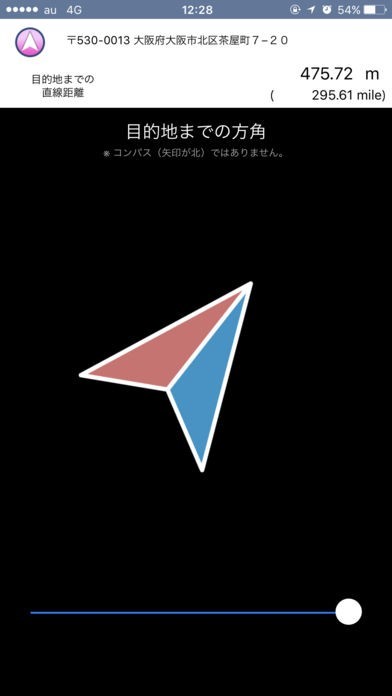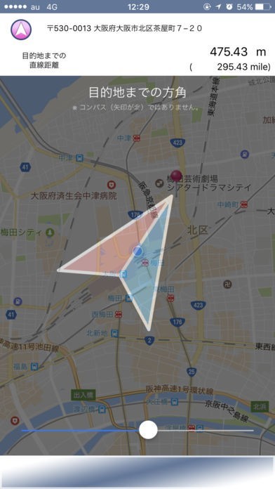 App Storeより引用"目的地×方角"は地図を読むのが苦手な方のために、目的地までの方角だけを表示したアプリです。