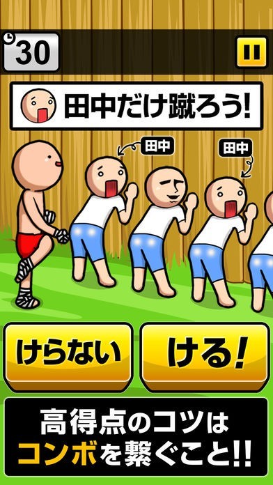 「田中にタイキック2」は30秒間でどれだけ田中にタイキックを決められるかというゲームです。 並んでいる人の中から田中だけを見分けて蹴るボタンを押します。 田中以外の人がいたら、蹴らないボタンを押します。 間違えると怒られてしまうので注意しましょう。