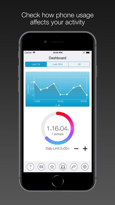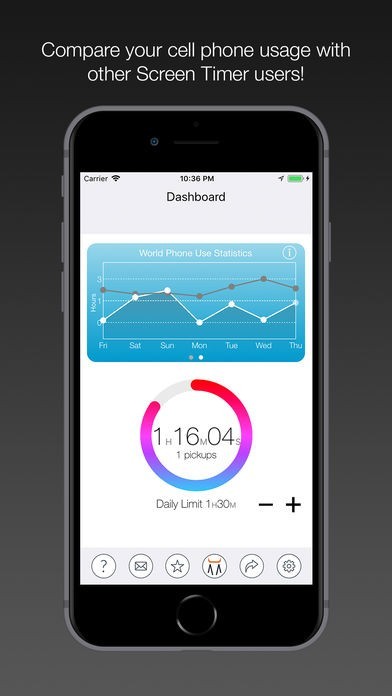 携帯電話の使用量を追跡し、結果を包括的なグラフで表示します。あなたの携帯電話の使用時間を減らすために個人の毎日の制限を設定し、あなたの人生で他の重要な活動のためのバランスを見つける!