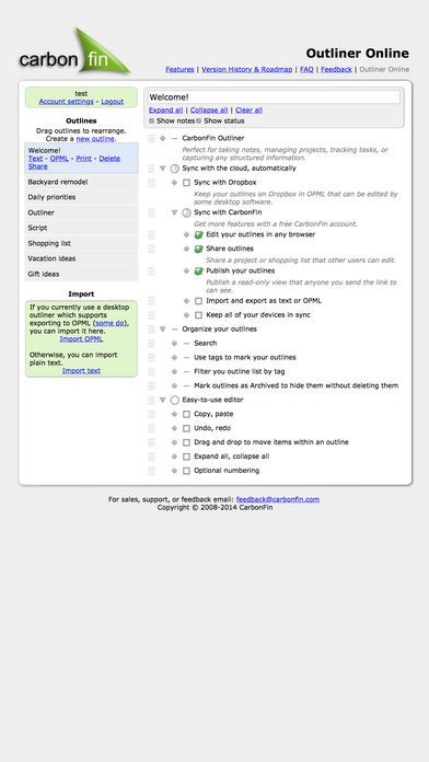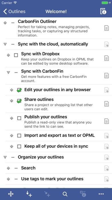 App Storeより引用CarbonFin Outliner allows you to organize your thoughts, tasks, and projects. Easily create a todo list for today, or track an entire project anywhere you are. Share your outlines, edit them online, and collaborate with other Outliner users.
