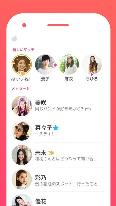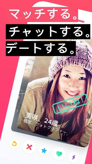 Tinderは、次々に表示されるユーザーの顔写真の画像を見て、「気になる人」「素敵な人」「会ってみたい人」なら、その画像を右にスワイプ、「ピンとこない人」なら、その画像を左にスワイプするだけという、とってもカンタンな操作でマッチングを楽しめる出会い系アプリです。あなたが右にスワイプした画像の相手が、あなたの顔写真を同じように右にスワイプすると「マッチ」となり、実際にチャットを使って会話を始めることが出来るという仕組みです。