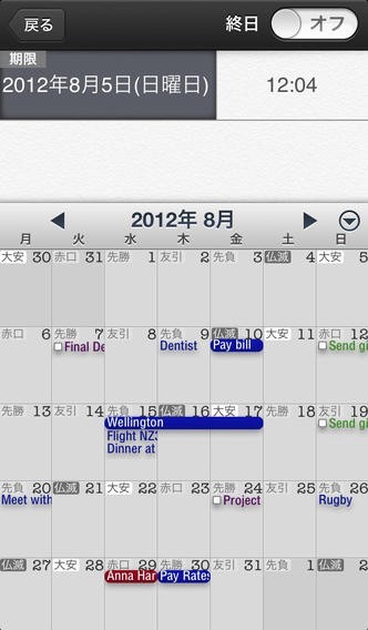 期日の指定は、カレンダーを見ながら簡単指定。リマインダーapp&カレンダーappの予定が表示されるので、わかりやすい。