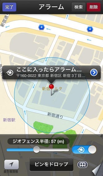 特定の場所に入ったとき、出たときに鳴るアラームを設定できます。