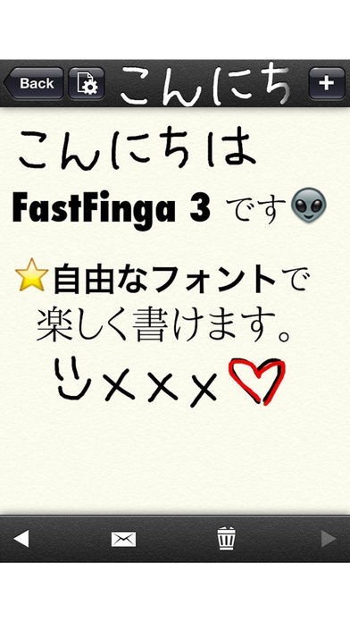 App Storeより引用FastFinga は手書きでメモを取ったり絵文字や写真入りの電子メールを送ったりすることができる、iPad/iPhone/iPod touch 用アプリです。Sketch Pad 3 の機能を全て含んでいます。