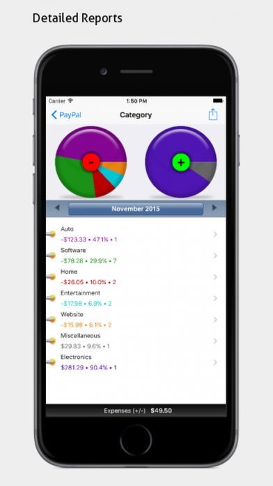 ** Analyze your overall financial situation by using the built-in reporting features of PocketMoney. Charts can help you visualize overspending and target areas to cut back. Furthermore, your data can be exported to desktop applications such as Microsoft Money and Excel.
