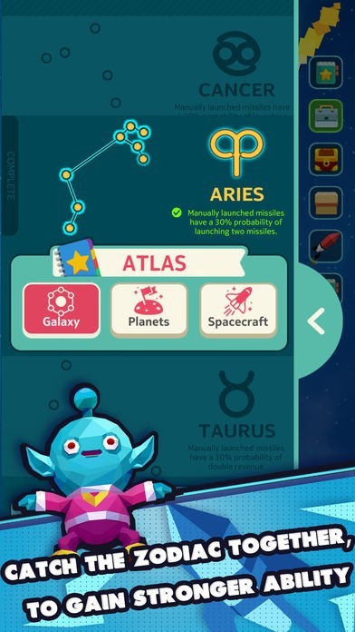 「ミサイルアップ」を行うことで、ミサイルの攻撃範囲や利益を増加させることができます。進むにつれ、宇宙人の強さが増すため、こまめにグレードアップを行うことを心がけましょう!