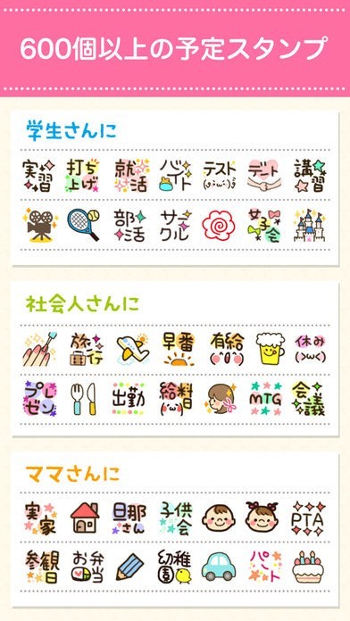 かわいいスタンプで予定帳を装飾できるようになっているスケジュールアプリです。スタンプの数はなんと600種類以上と豊富、使う場面毎に分けられているので探しやすくもなっています。