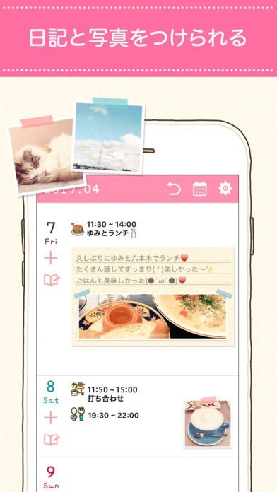 カレンダーですが、そこに日記が書けるようにもなっています。写真を貼ることもできるので、美味しいランチや楽しい思い出があった場合には日記として画像と一緒に残しておきましょう。