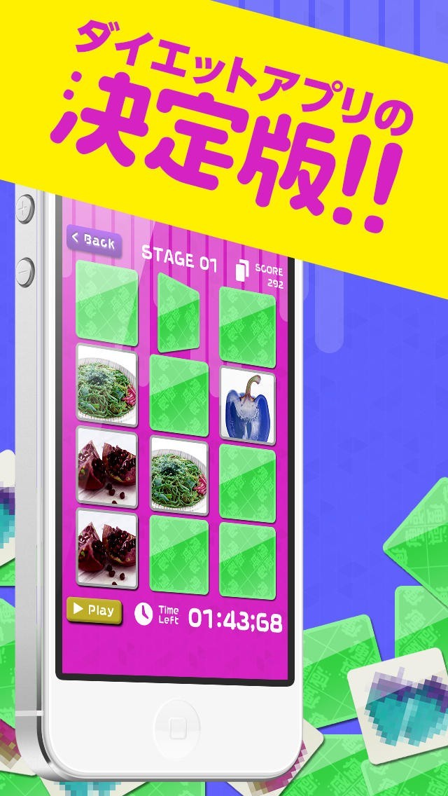 "痩せる神経衰弱 - ゲンナリ -"は、神経衰弱をする事で、食欲抑制や気分転換をし、ダイエットの手助けとなる事を目的として作られたアプリです。ゲームのルールは普通の神経衰弱と同様ですが、神経衰弱のイラストの食べ物が、青いケーキや緑色のステーキなど異色のビジュアルで食欲減退を促します。また、おやつやご飯の時間にアラームを設定できる機能を備えており、規則正しい食事をサポートします。さらに、カードが移動する仕組みを取り入れたタイムトライアル形式のゲームなど、集中してゲームに取り組む事で、知らぬ間に食欲が収まりダイエットへと導きます。このように、イラストやゲーム性に加えて、BGMの仕上がりも高く、楽しくダイエットをしたい方には最適な仕様となっています。