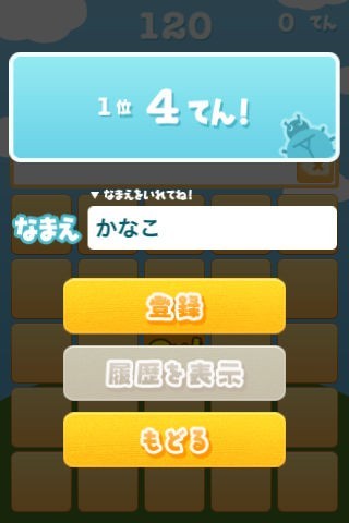 ゲーム終了後には得点が表示されるので必要に応じて名前と得点を登録することができます。自動的に順位付けされてランキングから見返せるため大人数で競い合うときには便利です。