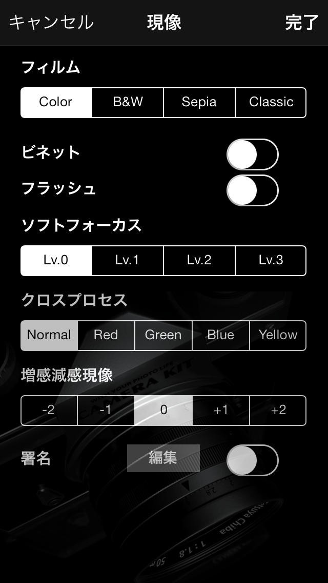 カラーやモノクロ、ポジフィルムのネガ現像(又はその逆)を再現したクロスプロセス、幻想的なソフトフォーカス効果、増減感による大胆な濃淡再現などフィルムならではの特徴的なエフェクトを搭載。味わい深いフィルム感を大切にしました。写真にはちょっとした署名(例えば貴方のコピーライトなど)も入れることが出来ます。