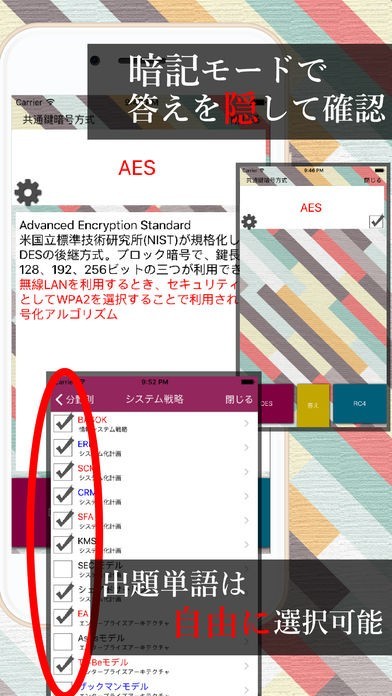 出題したいワードにチェックをつけ、意味を隠した状態で表示していく暗記モードを搭載しています。学習期間中の日課としてや試験前のチェックにもつかえるとなっています。